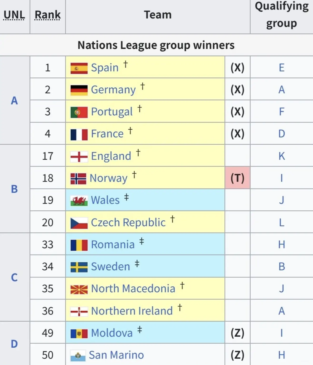 根据欧足联的出线规则,那些在世预赛中没有排在小组前2名的球队,如果在欧国联中排在小组头名位置,将有机会获得附加赛名额,该名额共有4个。瑞典队在上届欧国联中排在C级联赛A组榜首位置,在这一外卡通道中,瑞典是第10位的顺位。而排在他之前的西班牙、德国、葡萄牙、法国、英格兰、挪威用不到该“复活资格”,因此附加赛入场券可以顺延至瑞典,成为4个名额之一的持有者。